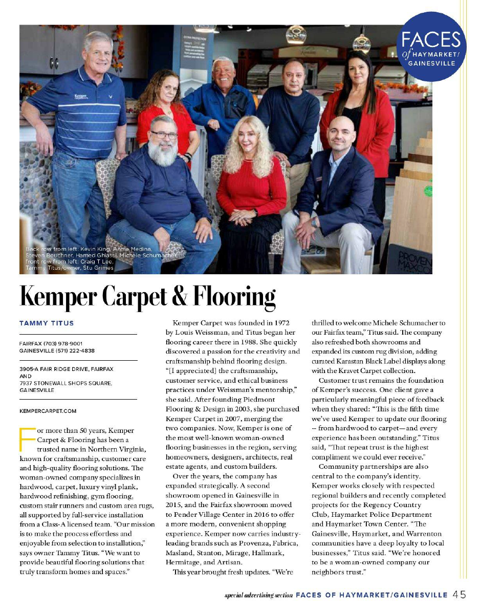 The distinguished reputation of Kemper Carpet & Flooring stands above the competition. Founded in 1972 and with more than 168 years of combined experience, there is no flooring issue we can’t resolve. Kemper Carpet is now a highly respected women-owned, local business providing top-notch quality flooring and unprecedented value. From point of sale to installation, the Kemper team creates a memorable and valuable buying experience.